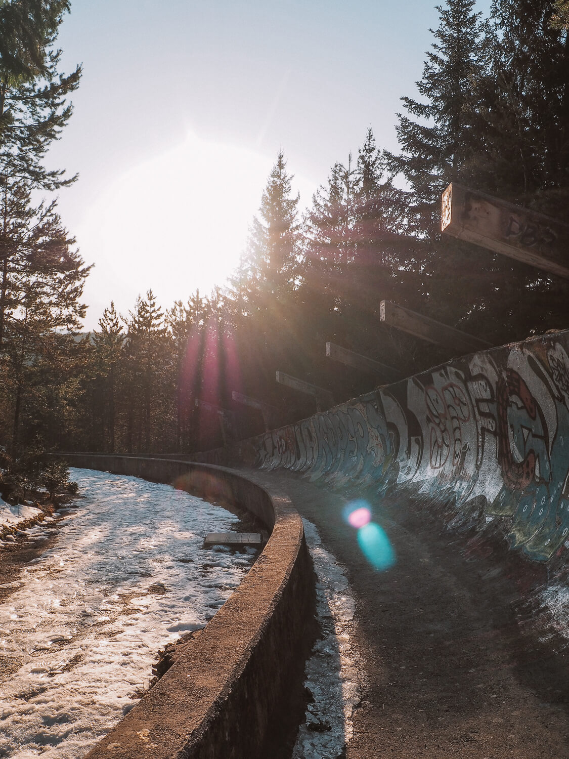 Im Winter kann die verlassene Bobbahn eisig und gefährlich sein, aber es gibt Wanderwege direkt daneben, falls du nicht auf ihr laufen kannst.